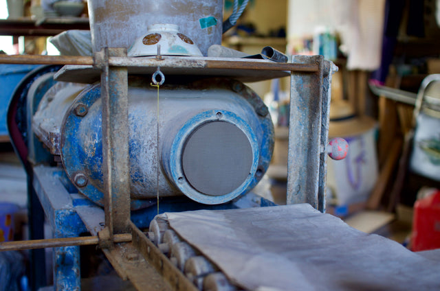 The clay is kneaded using either a machine as shown in the photo or by hand.